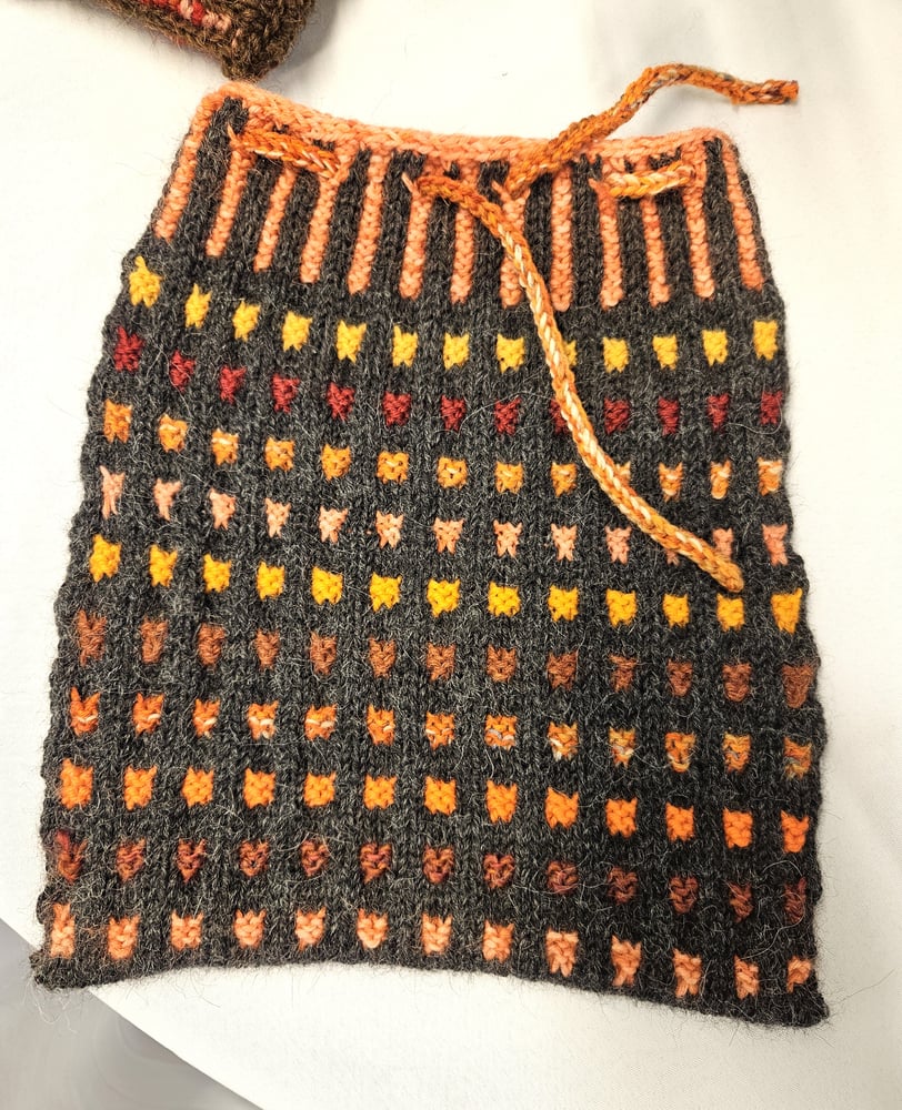 Mosaik – projektpose strikkes nedefra og op. Der slås op med Krydsopslag og strikkes rundt i skiftevis 2-farvet rib og glatstrik = små TERN. Efterfølgende sys bunden sammen. Poserne er oplagte at strikke i garnrester fra lageret, og du kan sagtens blande kvaliteterne.